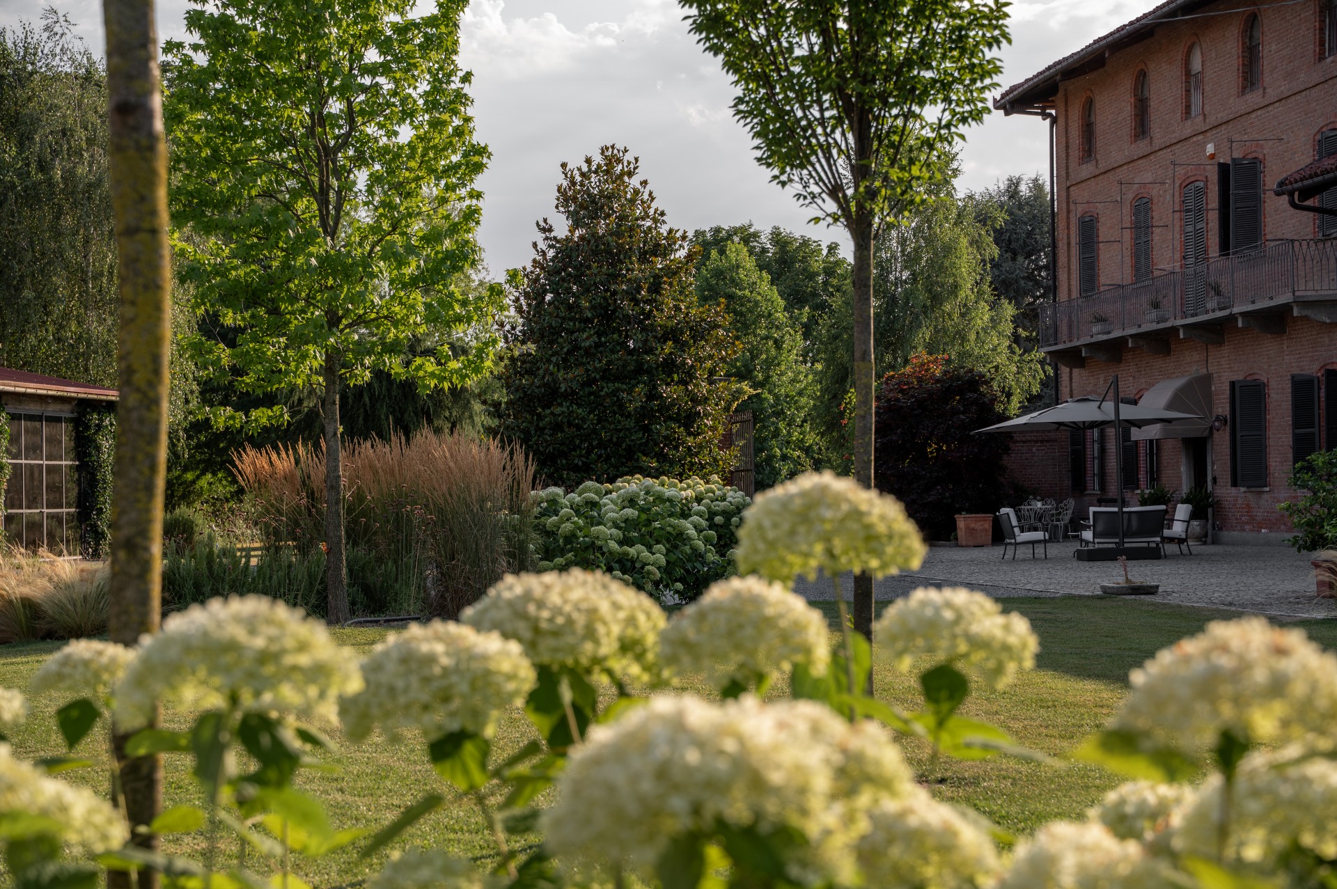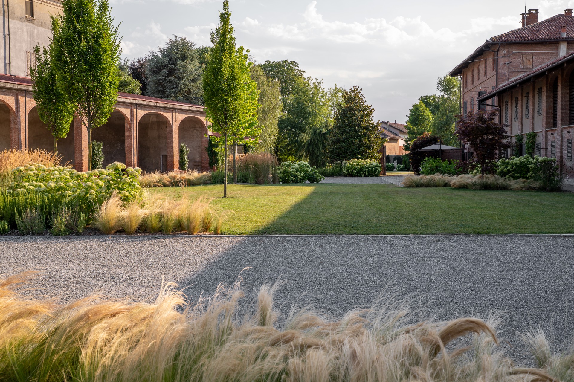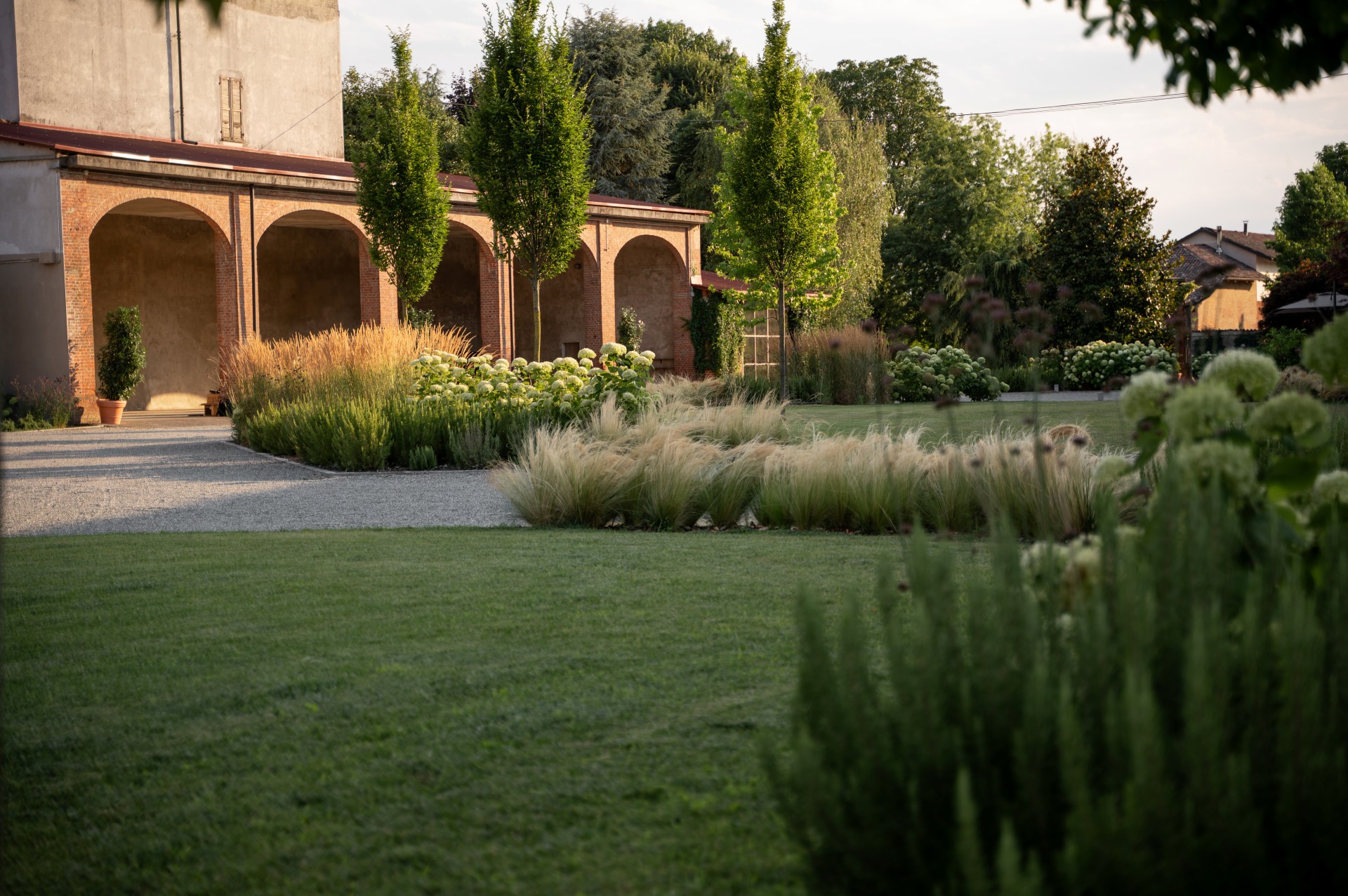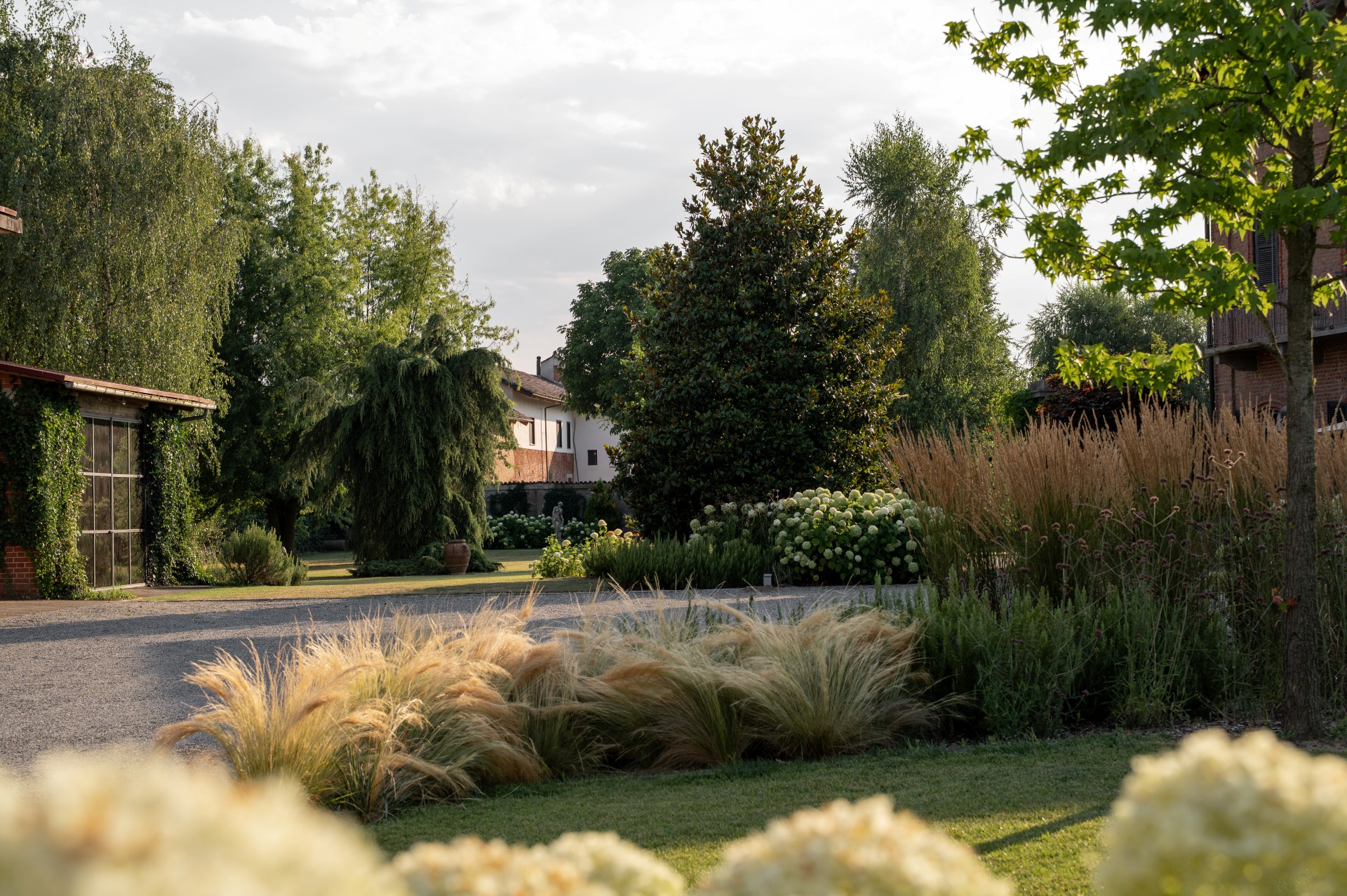 Gruppi di alberelli e singoli esemplari, abbracciati da macchie di perenni e graminacee, esaltano l'elegante cortile creando nuove prospettive e punti di fuga che portano ad abbattere limiti e filtri tra aree comuni e private. Bianche nuvole di ortensie illuminano il casale e, con il loro susseguirsi, guidano lo sguardo verso gli estremi del parco.