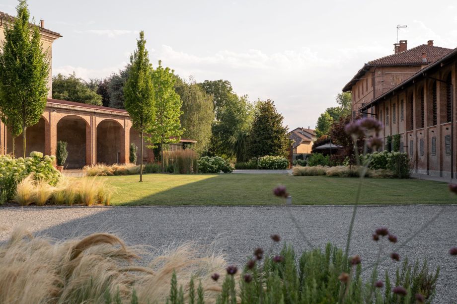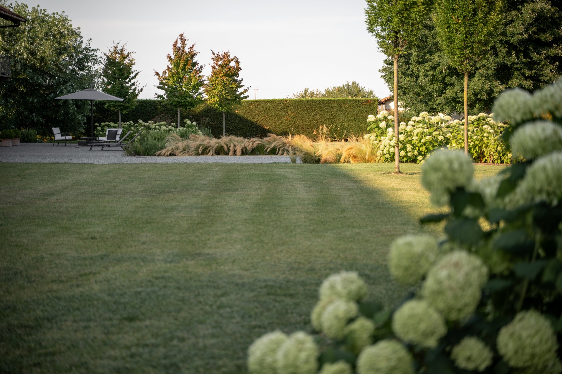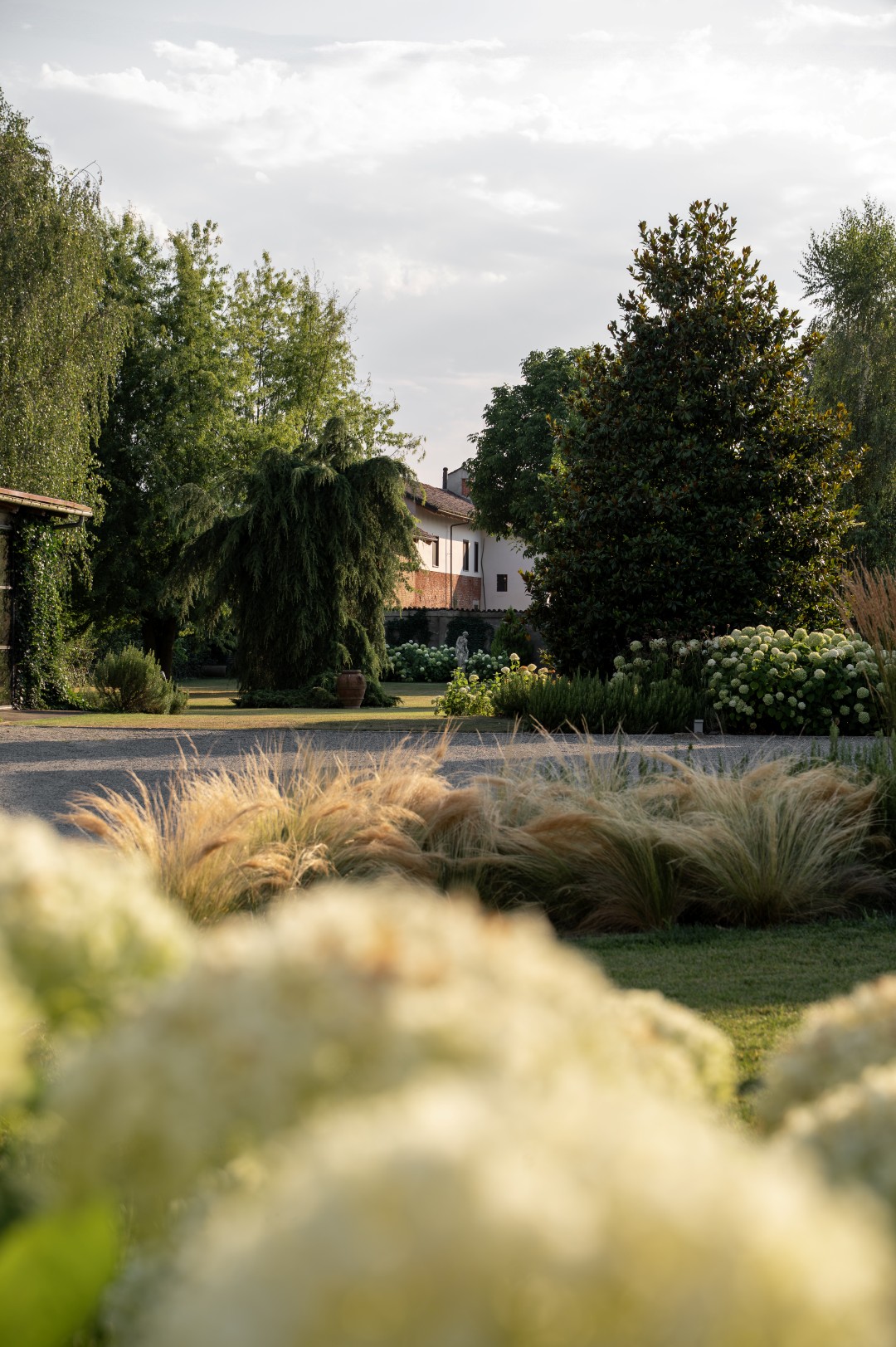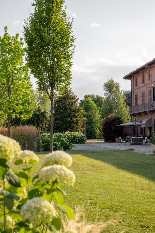 Gruppi di alberelli e singoli esemplari, abbracciati da macchie di perenni e graminacee, esaltano l'elegante cortile creando nuove prospettive e punti di fuga che portano ad abbattere limiti e filtri tra aree comuni e private. Bianche nuvole di ortensie illuminano il casale e, con il loro susseguirsi, guidano lo sguardo verso gli estremi del parco.