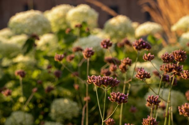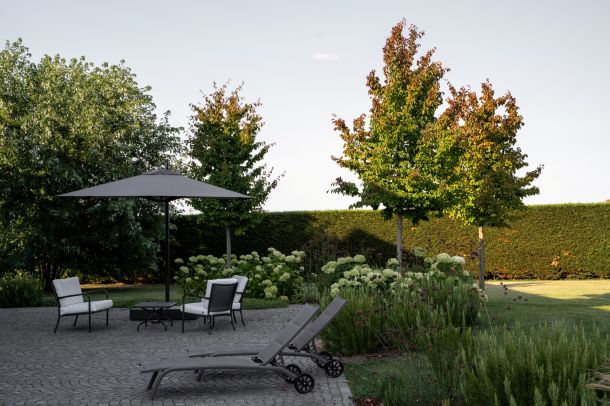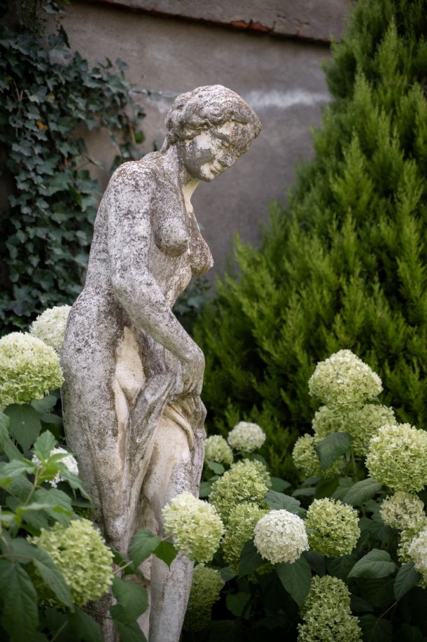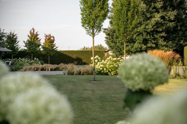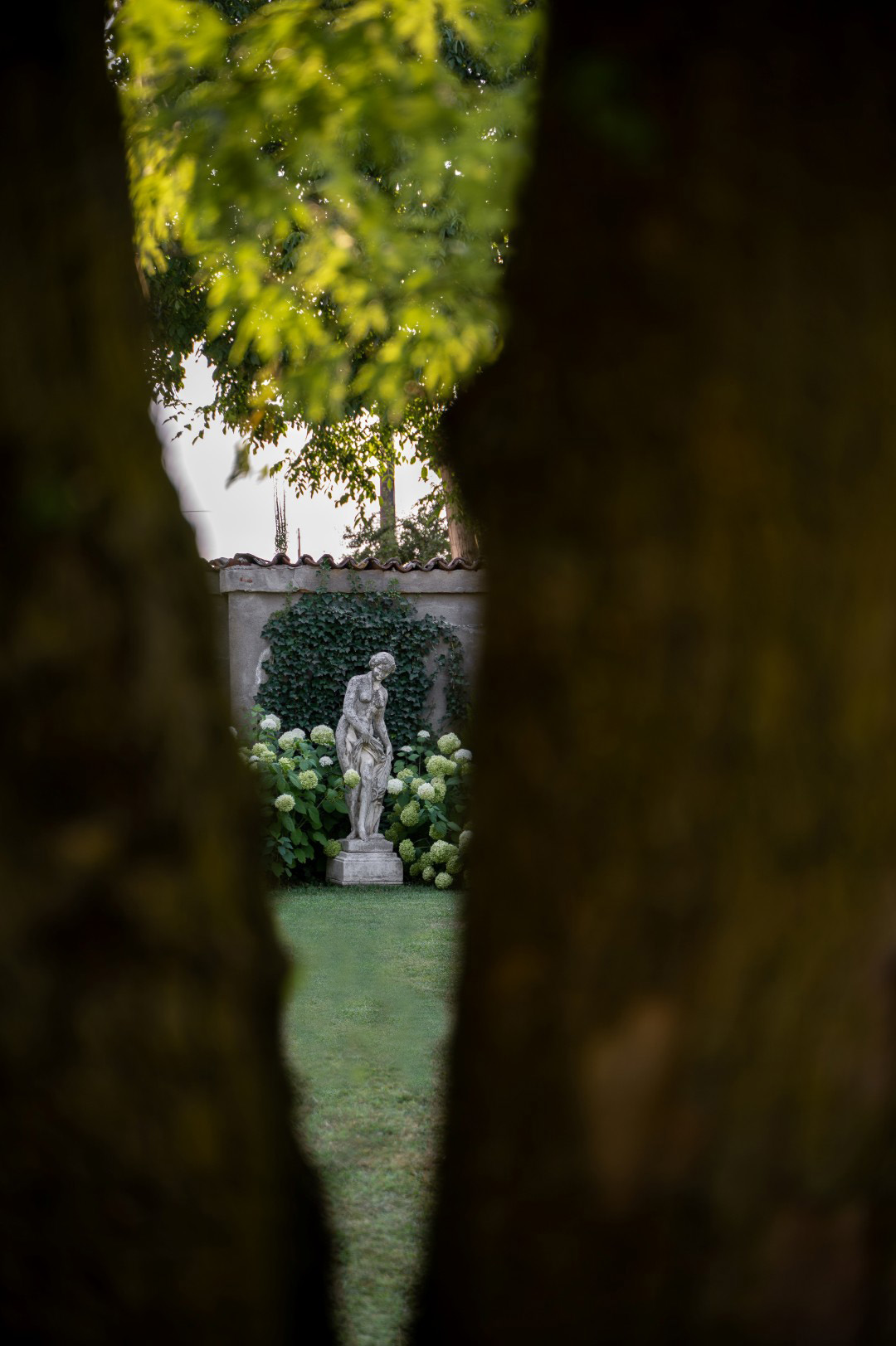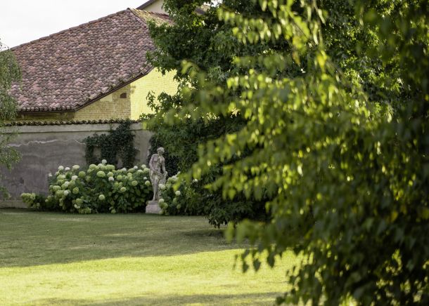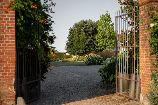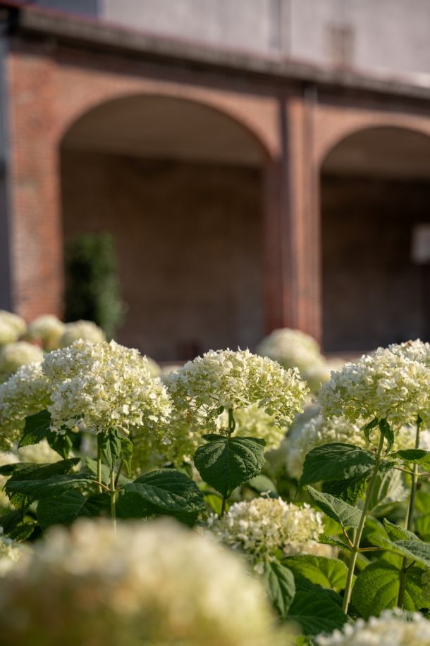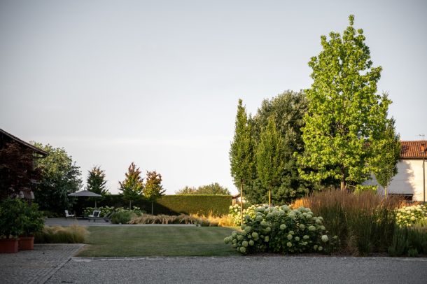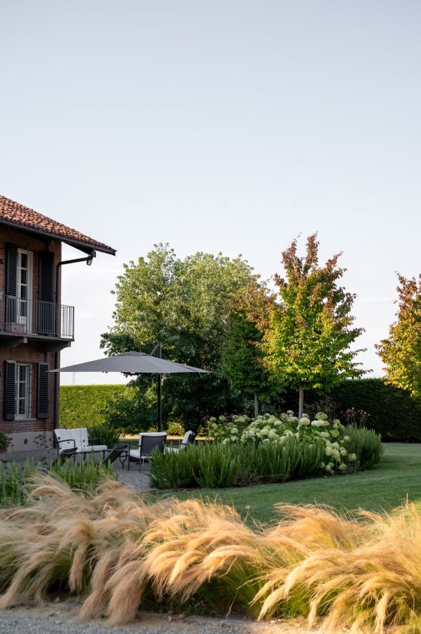 Gruppi di alberelli e singoli esemplari, abbracciati da macchie di perenni e graminacee, esaltano l'elegante cortile creando nuove prospettive e punti di fuga che portano ad abbattere limiti e filtri tra aree comuni e private. Bianche nuvole di ortensie illuminano il casale e, con il loro susseguirsi, guidano lo sguardo verso gli estremi del parco.