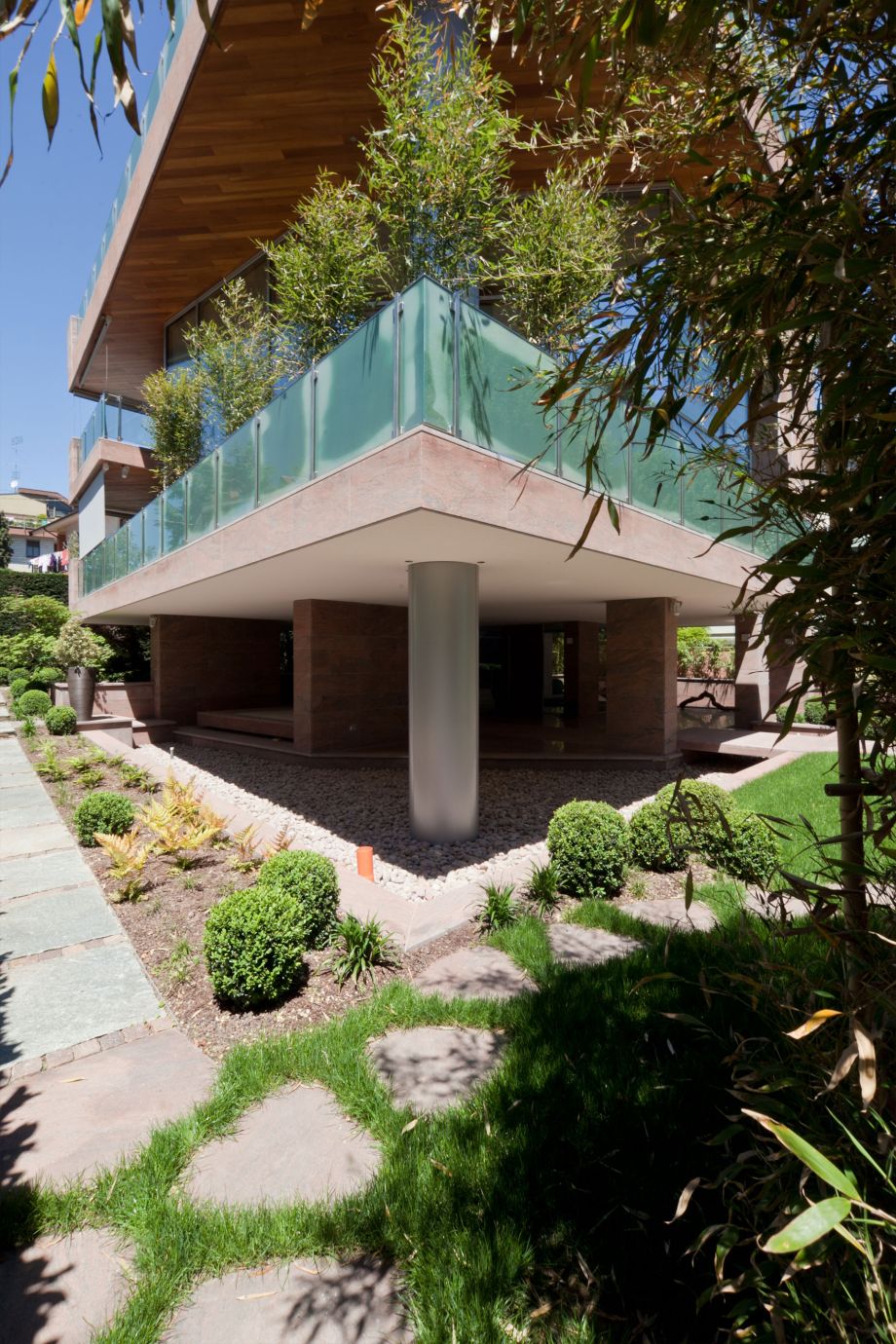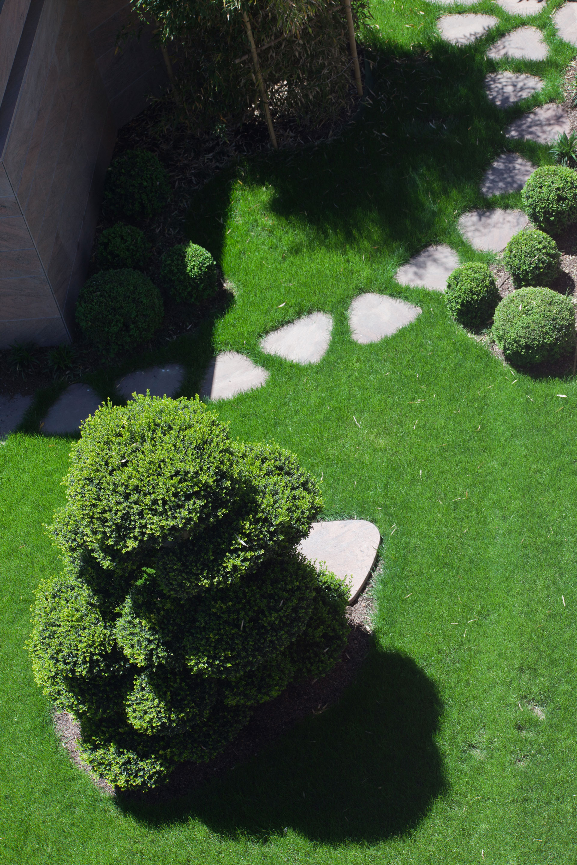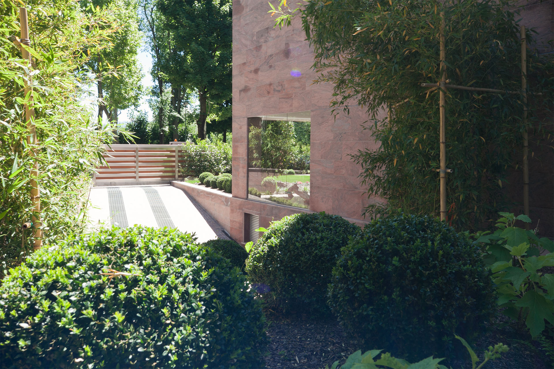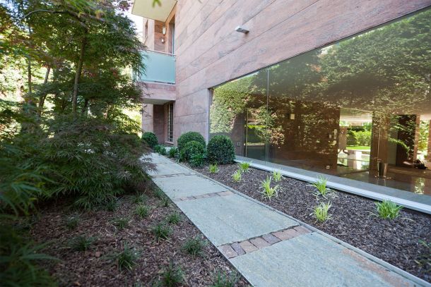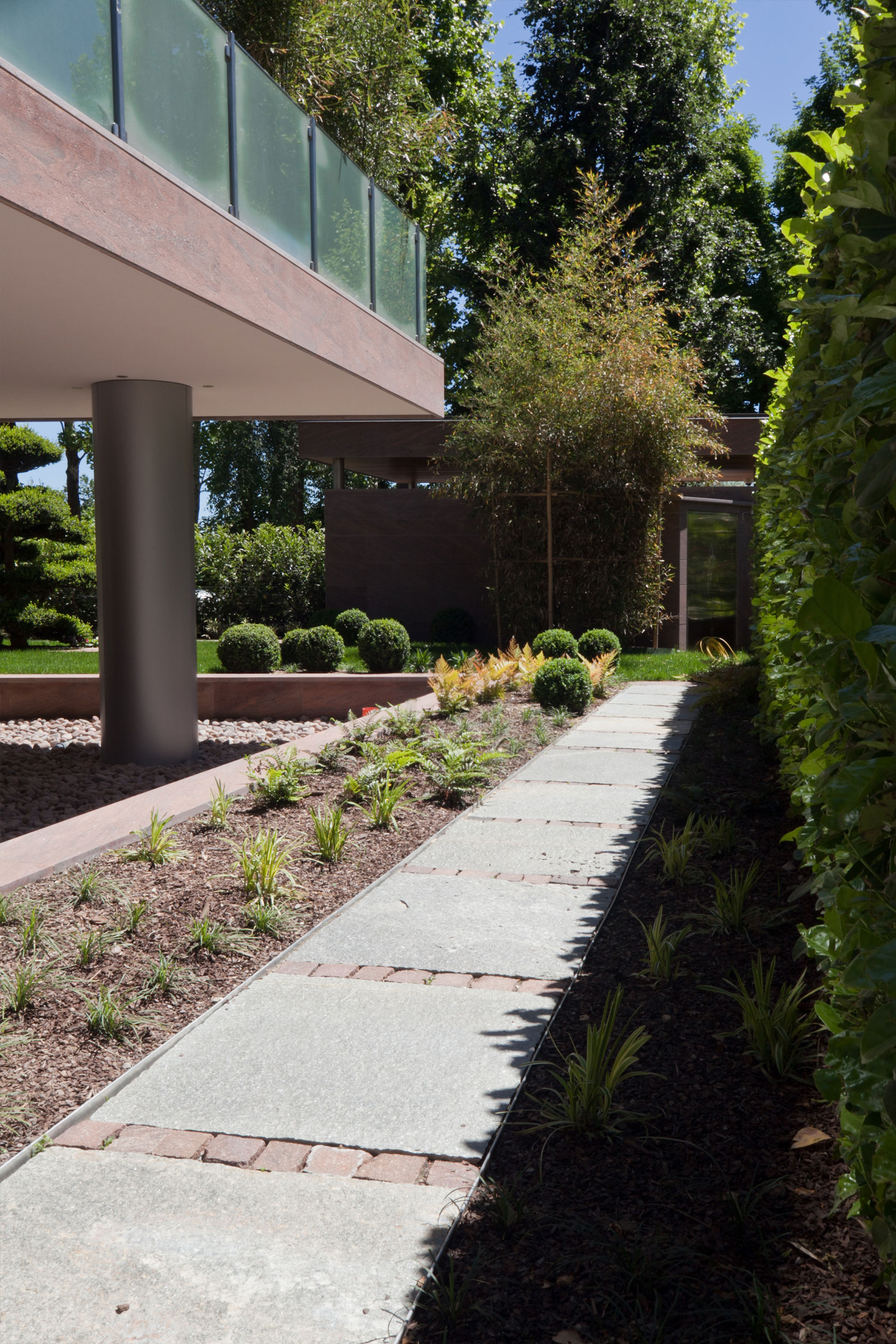 Macrobonsai di Buxussempervirenstopiati ad arte sono circondati da un perimetro di selvaggio bambù, che immerge la struttura in una privacy totale. Una serie di Acer japonicum sono immersi in un sottobosco di felci e Liriope muscari, ad impreziosire gli spazi e regalare sensazioni di freschezza naturale.