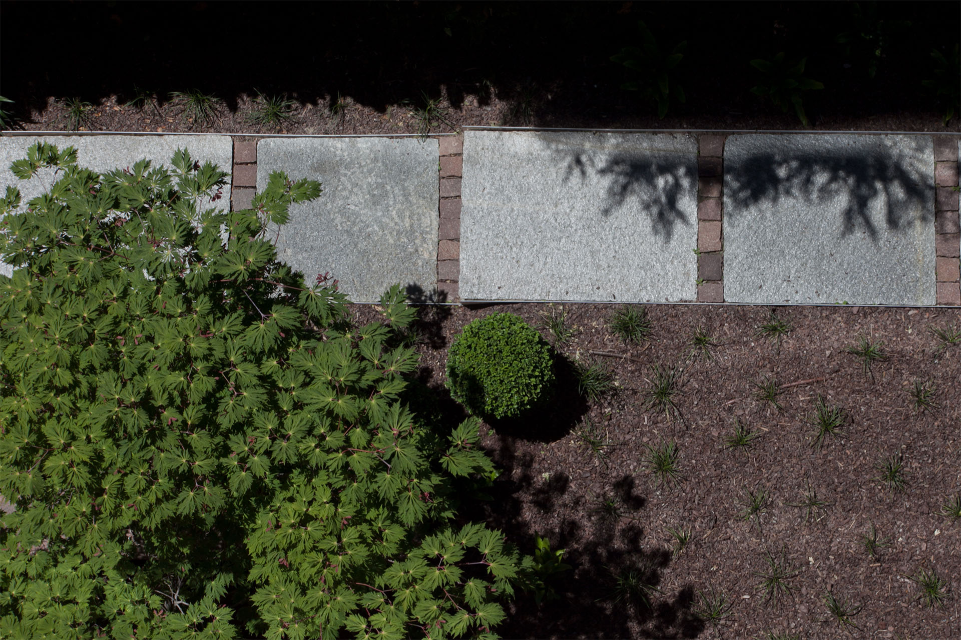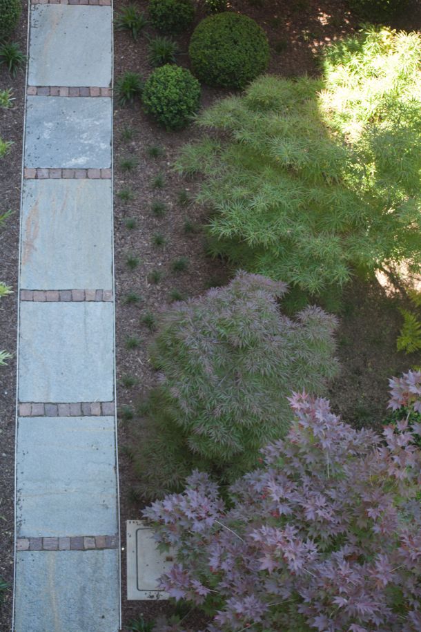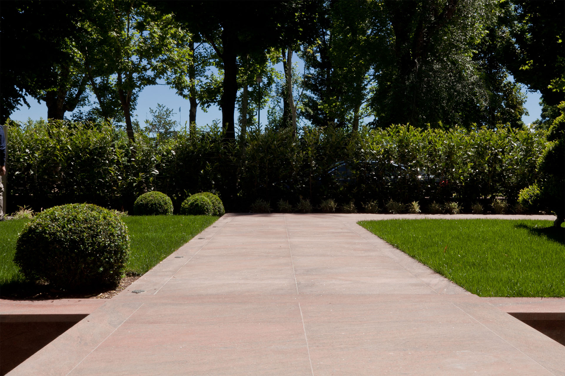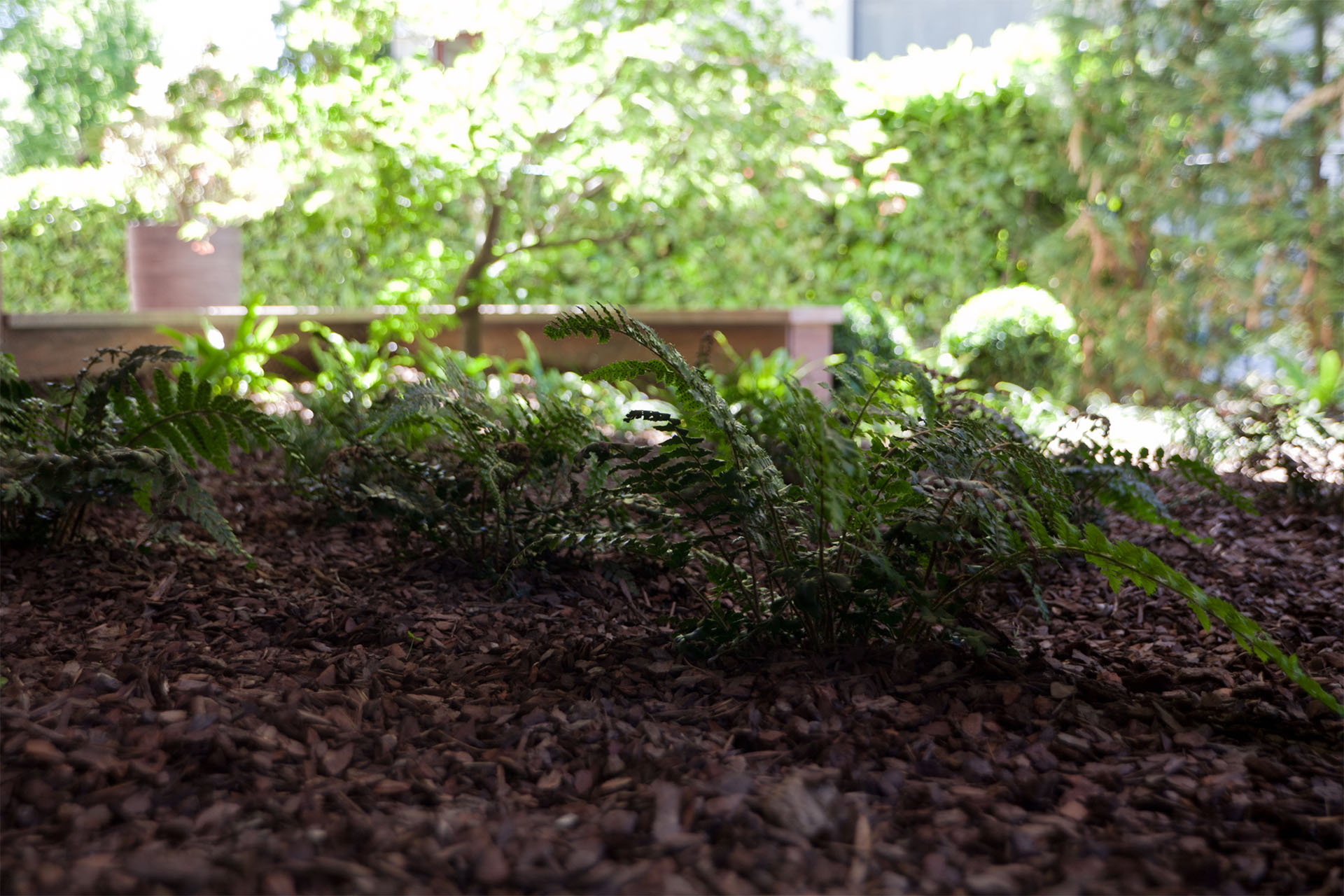 Macrobonsai di Buxussempervirenstopiati ad arte sono circondati da un perimetro di selvaggio bambù, che immerge la struttura in una privacy totale. Una serie di Acer japonicum sono immersi in un sottobosco di felci e Liriope muscari, ad impreziosire gli spazi e regalare sensazioni di freschezza naturale.