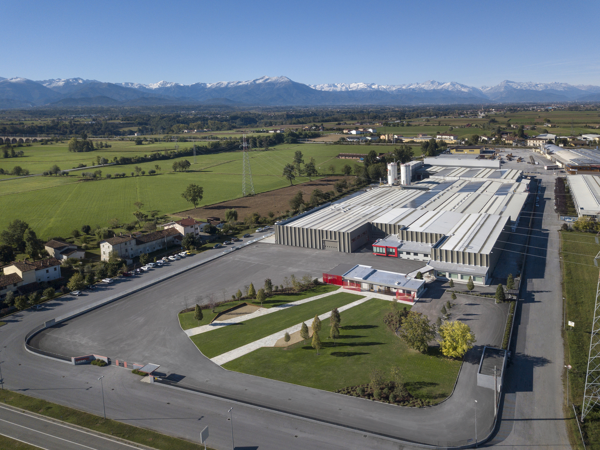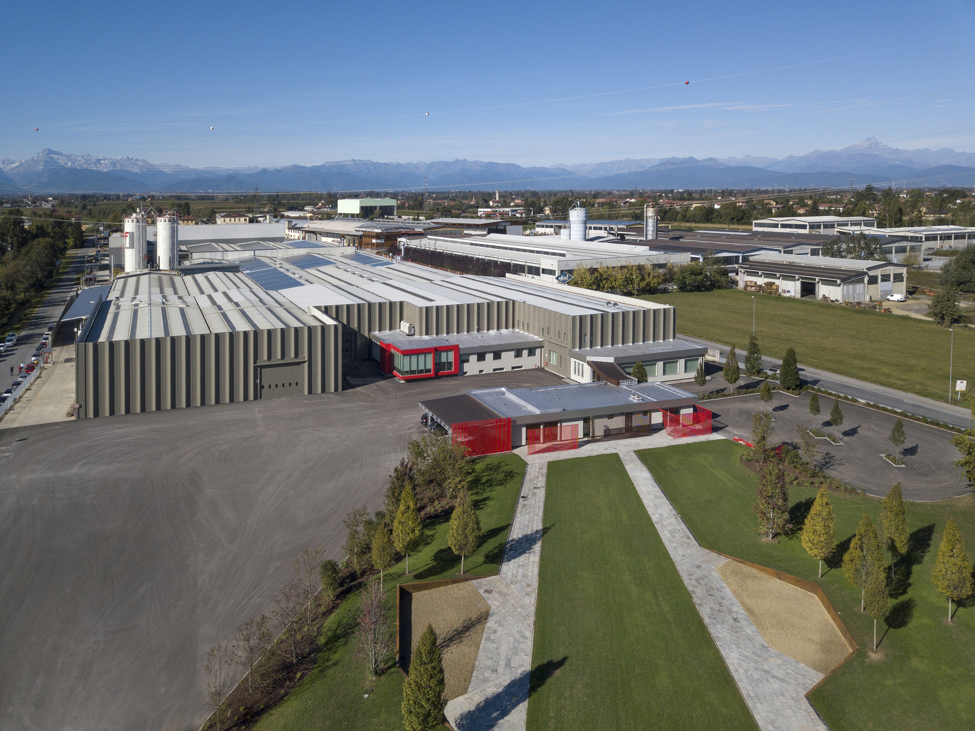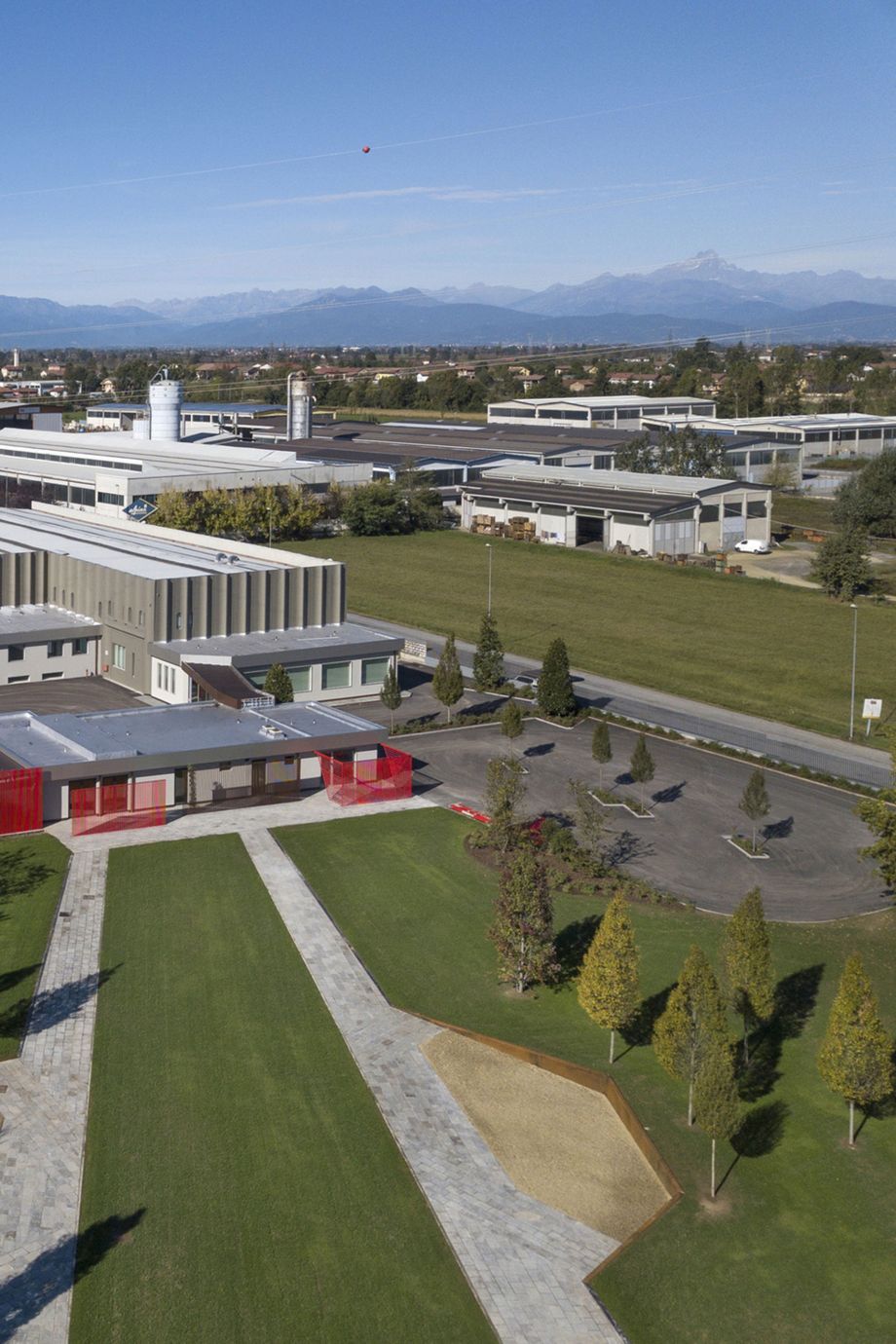 I due grandi percorsi pedonali centrali, convergenti al cuore dell'azienda, formano attraverso delle zone di sosta rialzate con pareti di corten, altri boschetti di carpini, piramidali, una scelta di estrema eleganza e semplicità che introduce alla nuova visual identity e soprattutto alla soprattutto alla vision aziendale.