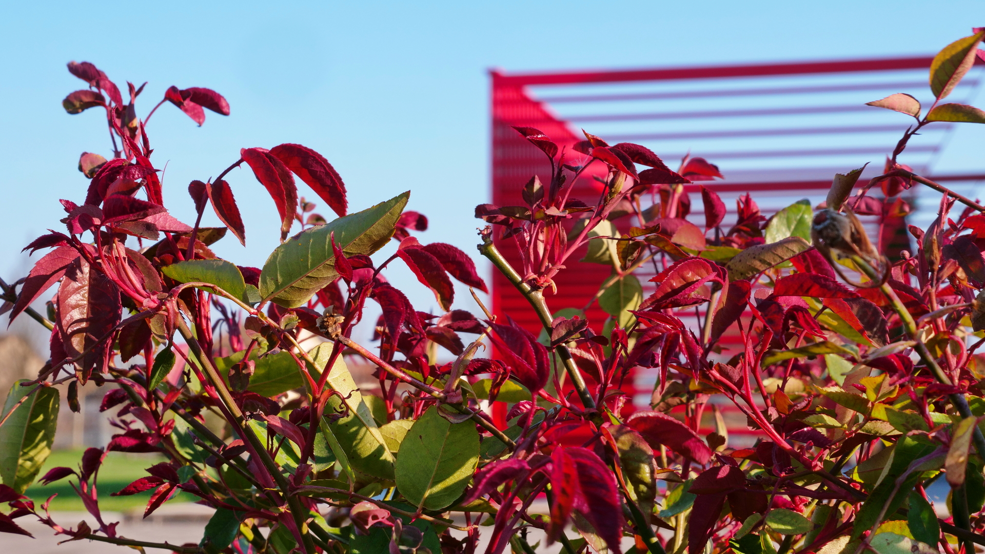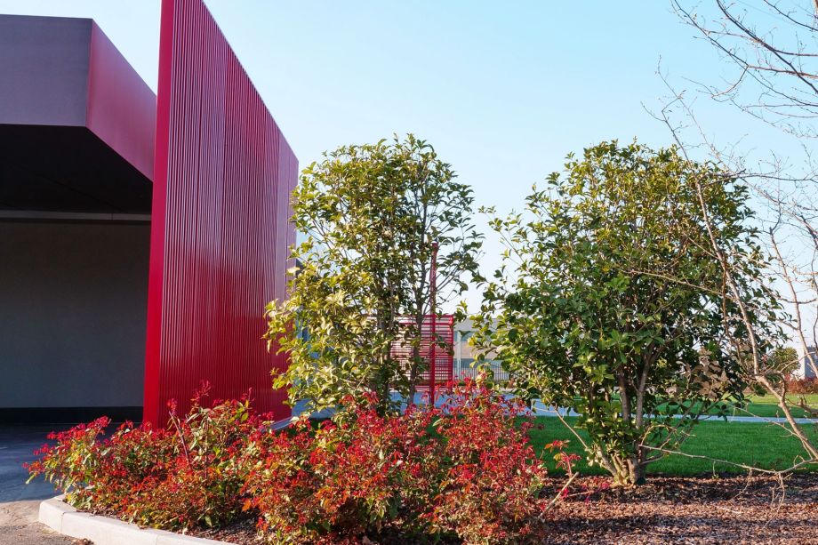 Armando ha progettato e costruito una superficie verde di più di 3500 mq, dove il tappeto erboso viene abbracciato lungo tutto il perimetro da Carpini che siedono su grandi onde di Rosa chinensis ‘Sanguinea’, che grazie alla loro sfumatura rossa portano anche nelle aiuole il colore del brand.